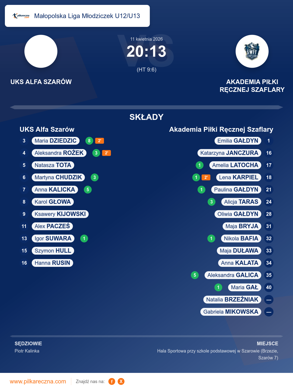 UKS Alfa Szarów 20–13 Akademia Piłki Ręcznej Szaflary