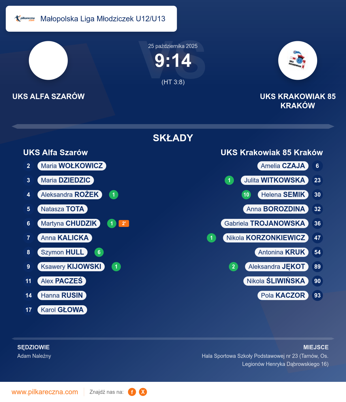 UKS Alfa Szarów 9–14 UKS Krakowiak 85 Kraków