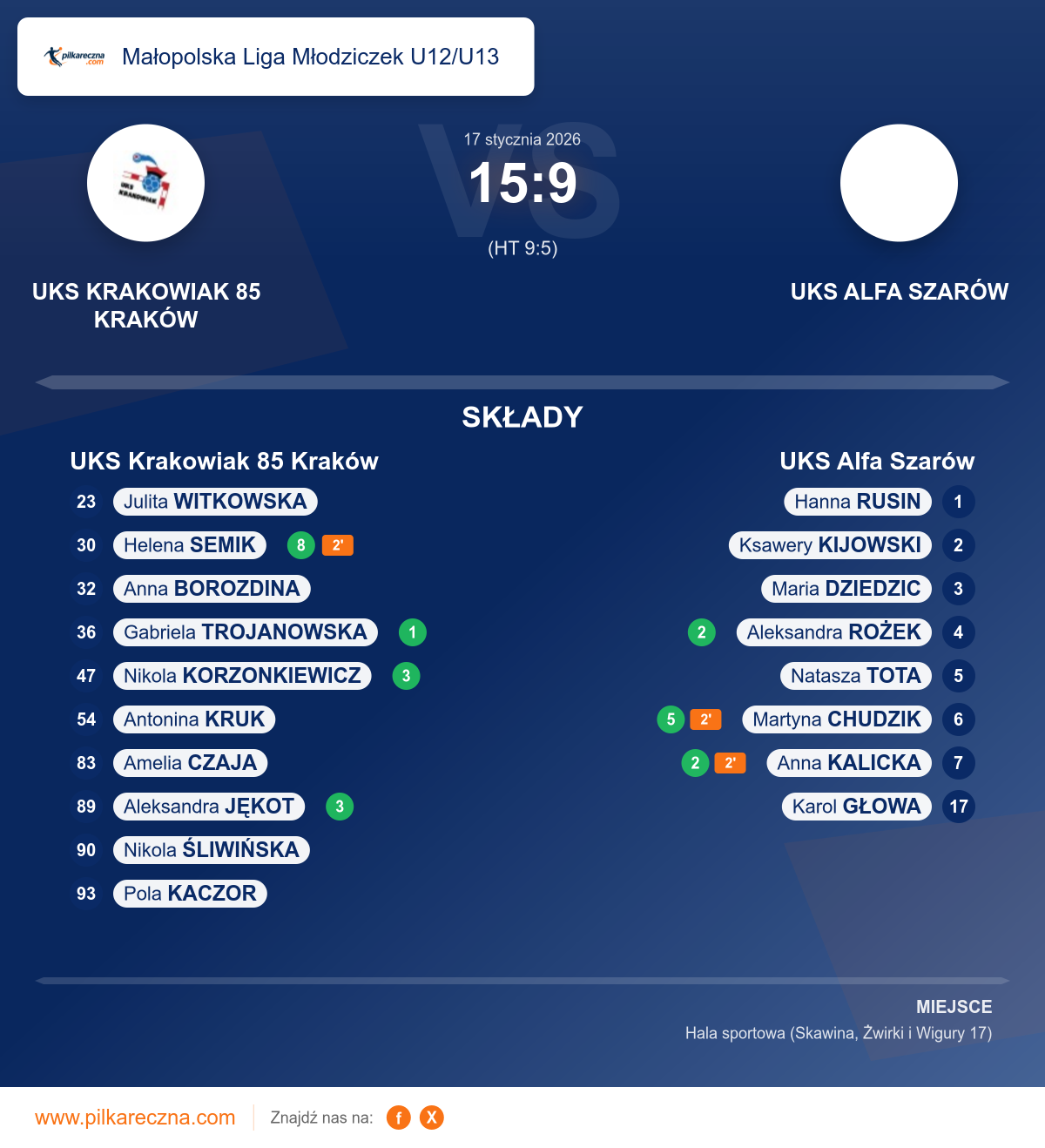 UKS Krakowiak 85 Kraków 15–9 UKS Alfa Szarów