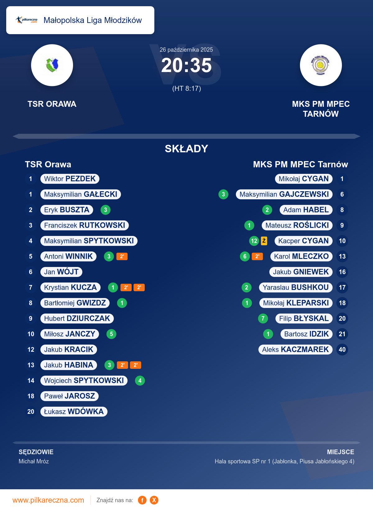 Zawodnicy: Miłosz Janczy (5), Wojciech Spytkowski (4), Antoni Winnik (3), Eryk Buszta (3), Jakub Habina (3), Bartłomiej Gwizdz (1), Krystian Kucza (1), Franciszek Rutkowski, Hubert Dziurczak, Jan Wójt, Łukasz Wdówka, Maksymilian Spytkowski, Paweł Jarosz