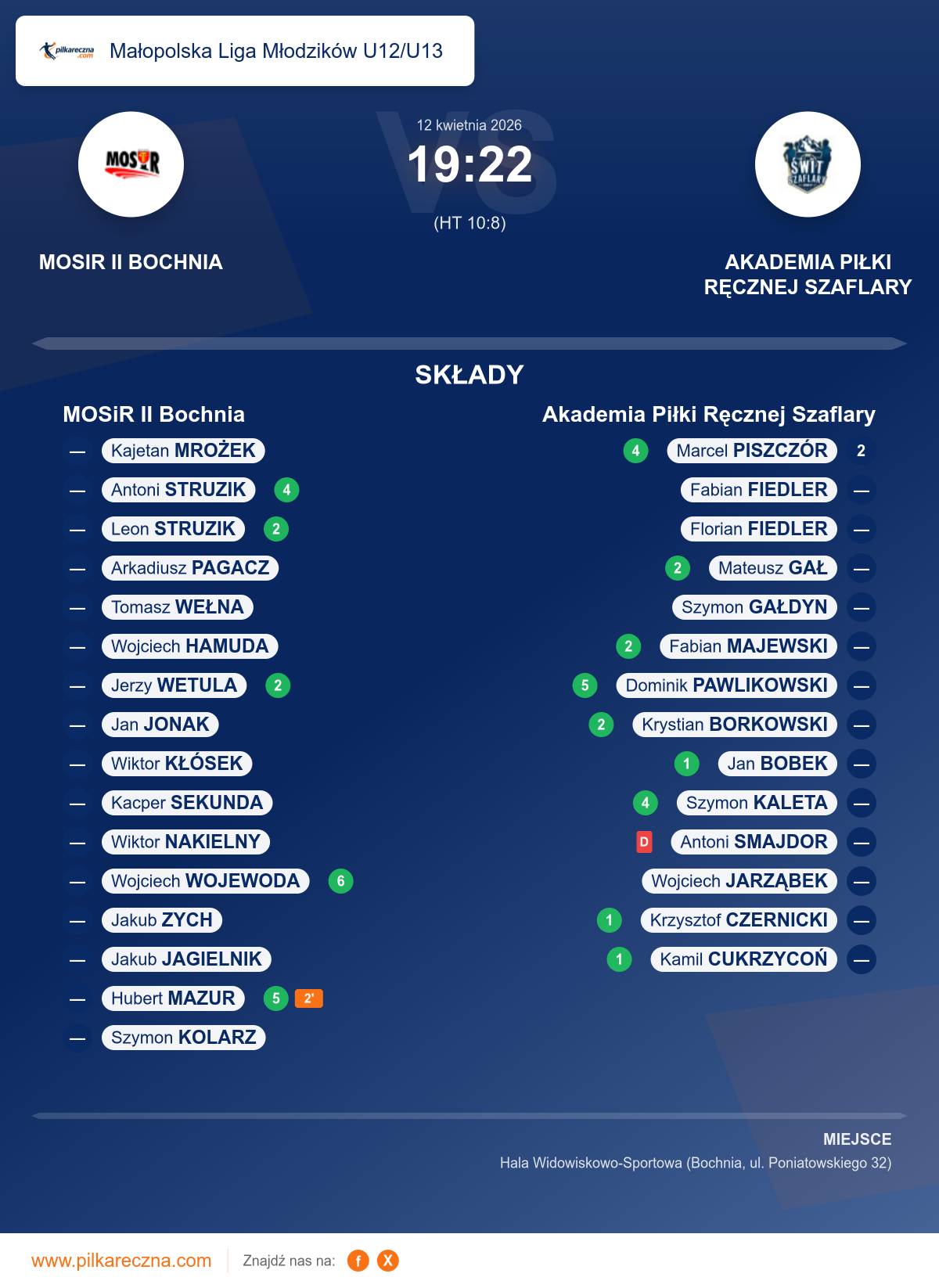 Uwagi: Zawodnik drużyny gości Akademia Piłki Ręcznej Szaflary Smajdor Antoni nr 12 otrzymał karę dyskwalifikacji zgodnie z przepisem 8:5 - zderzenie z biegnącym przeciwnikiem na kontrze.