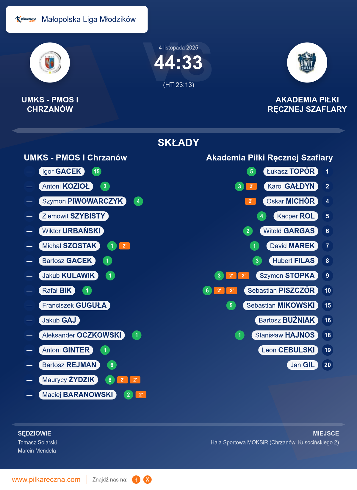 Uwagi: DECYZJA KGID MZPR NR 12/2025/26 W sprawie zawodów z dnia 4 listopada 2025 roku o numerze K/MłM/26 UMKS PMOS Chrzanów ? Akademia Piłki Ręcznej Szaflary Komisja Gier i Dyscypliny Małopolskiego Związku Piłki Ręcznej postanawia: 1. Zweryfikować wynik zawodów jako 44:33 na korzyść UMKS PMOS Chrzanów. 2. Przypisać zawodnikowi Bartosz Rejman (UMKS PMOS Chrzanów) 6 bramek (w tym 1 wykorzystany rzut karny). 3. Przypisać bramkę nr 34 po stronie UMKS PMOS Chrzanów zawodnikowi Maurycy Ży-dzik; suma bramek tego zawodnika wynosi 8.