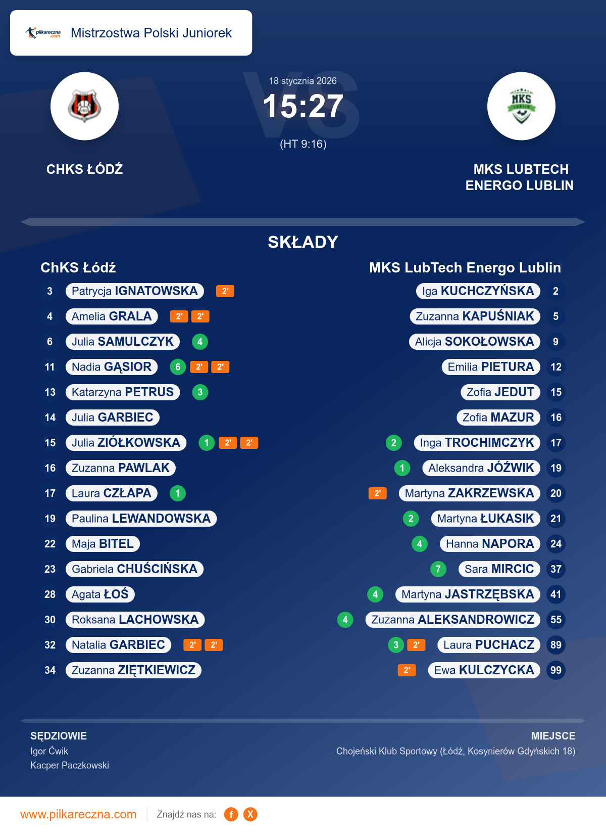 Uwagi: W 22 minucie meczu trener CHKS Tomasz Walicki otrzymał karę upomnienia zgodnie z przepisem 8:7a, krytykowanie decyzji sędziów. W trakcie meczu zawodniczka zespołu CHKS Łódź, nr 32, Natalia Garbiec doznała urazu lewej dłoni.