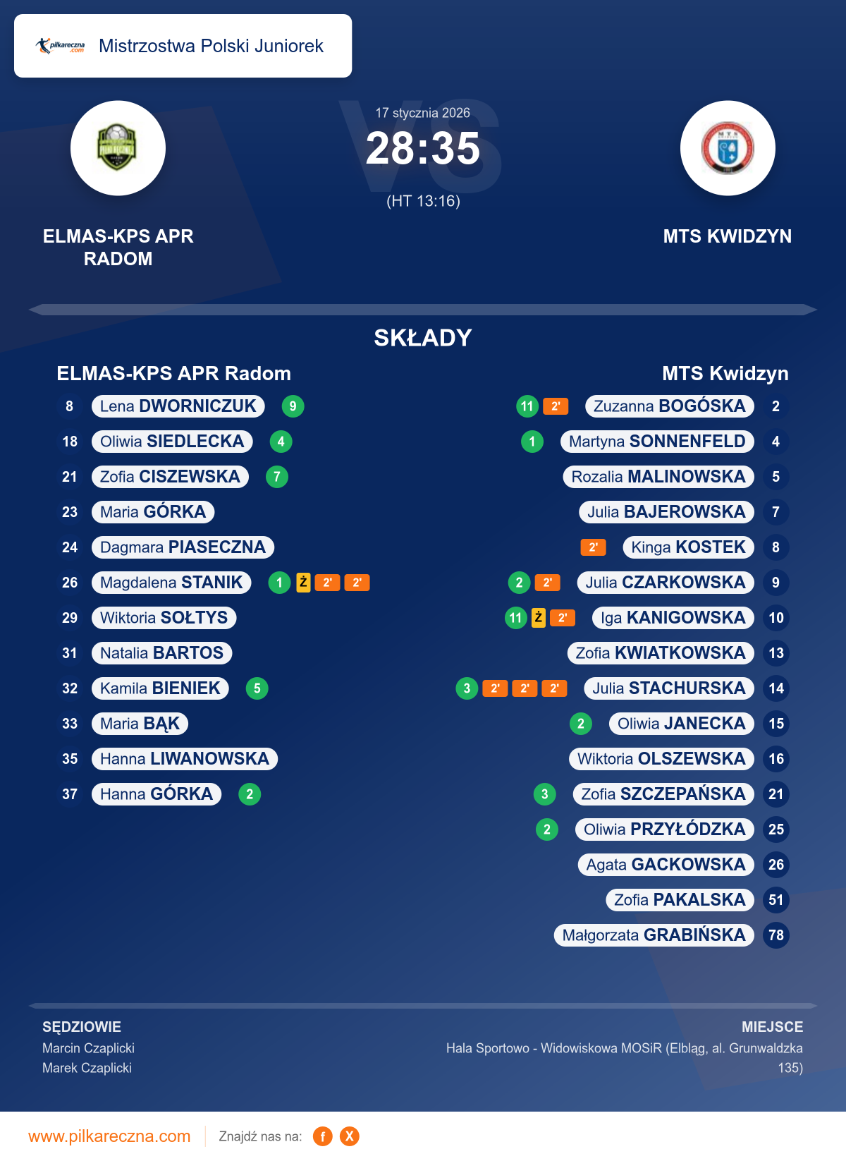 Zawodnicy: Lena Dworniczuk (9), Zofia Ciszewska (7), Kamila Bieniek (5), Oliwia Siedlecka (4), Hanna Górka (2), Magdalena Stanik (1), Dagmara Piaseczna, Hanna Liwanowska, Natalia Bartos, Wiktoria Sołtys