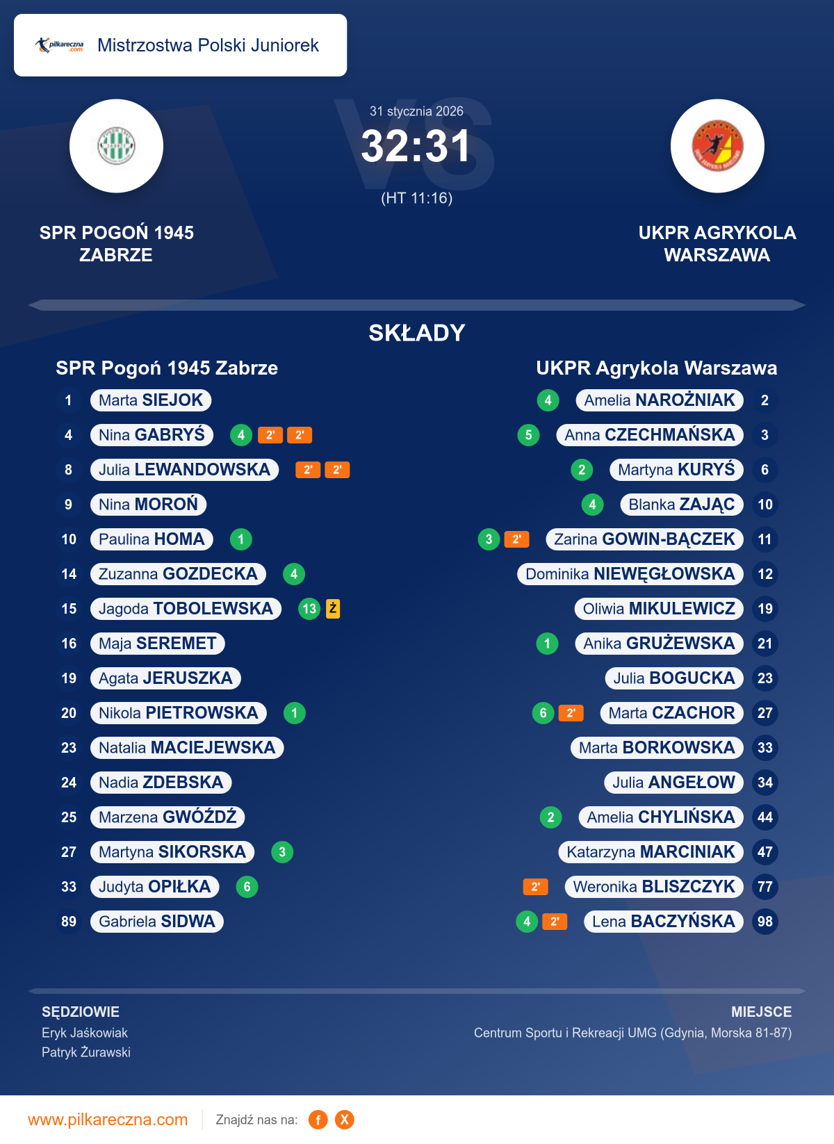 Wynik: 32–31 (HT 11–16)