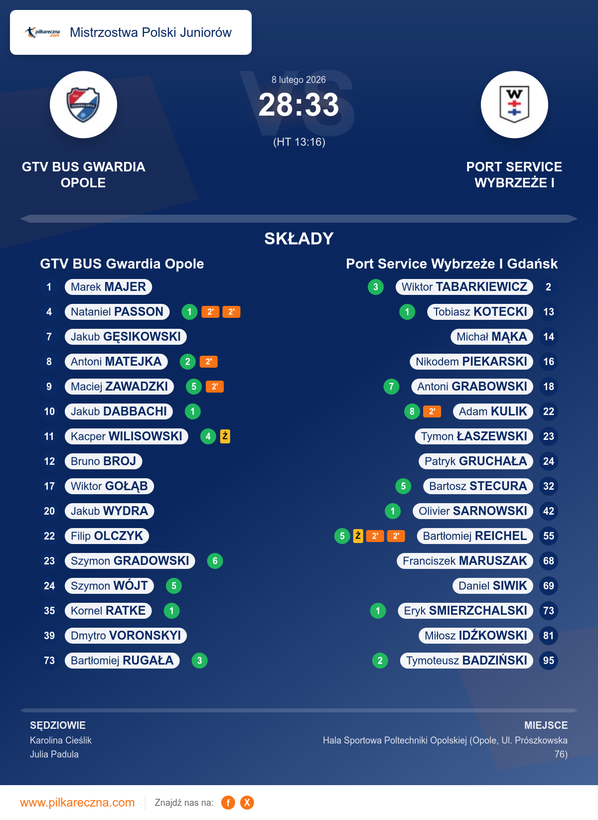 Uwagi: W 30 minucie meczu trener drużyny gospodarzy P. Gradowski Łukasz otrzymał karę upomnienia za protestowanie przeciwko decyzjom sędziowskim. Karę nałożono zgodnie z przepisem 8:7a.