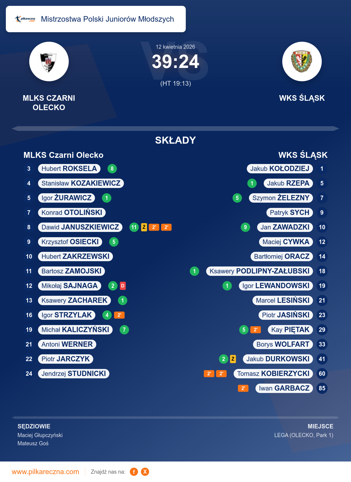 Uwagi: W 26:15 meczu zawodnik zespołu Gospodarzy nr 12 Sajnaga Mikołaj został ukarany dyskwalifikacją (czerwona kartka) zgodnie z przepisem 8:5a.
