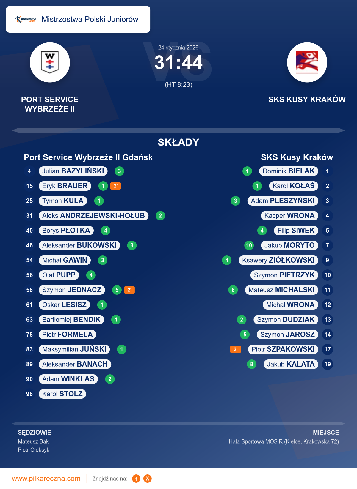 Zawodnicy: Jakub Moryto (10), Jakub Kalata (8), Mateusz Michalski (6), Szymon Jarosz (5), Filip Siwek (4), Ksawery Ziółkowski (4), Adam Pleszyński (3), Szymon Dudziak (2), Dominik Bielak (1), Karol Kołaś (1), Kacper Wrona, Michał Wrona, Piotr Szpakowski, Szymon Pietrzyk