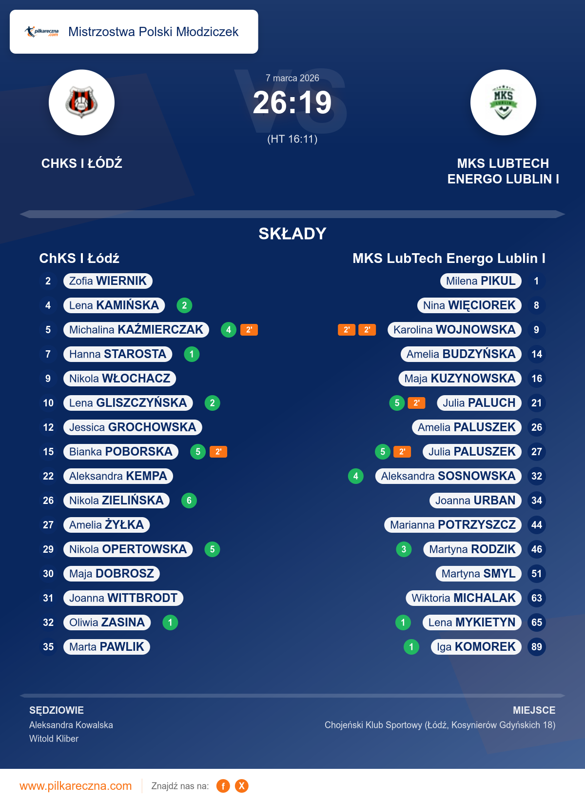 Zawodnicy: Nikola Zielińska (6), Bianka Poborska (5), Nikola Opertowska (5), Michalina Kaźmierczak (4), Lena Gliszczyńska (2), Lena Kamińska (2), Hanna Starosta (1), Oliwia Zasina (1), Amelia Żyłka, Joanna Wittbrodt, Maja Dobrosz, Marta Pawlik, Nikola Włochacz, Zofia Wiernik