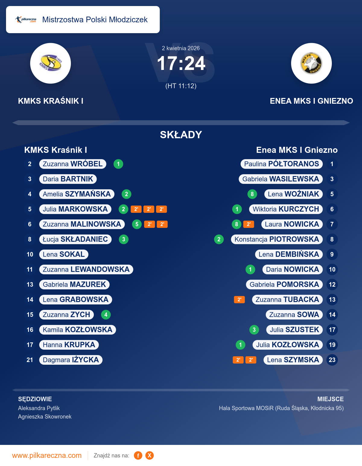 Zawodnicy: Zuzanna Malinowska (5), Zuzanna Zych (4), Łucja Składaniec (3), Amelia Szymańska (2), Julia Markowska (2), Zuzanna Wróbel (1), Daria Bartnik, Gabriela Mazurek, Hanna Krupka, Lena Grabowska, Lena Sokal, Zuzanna Lewandowska