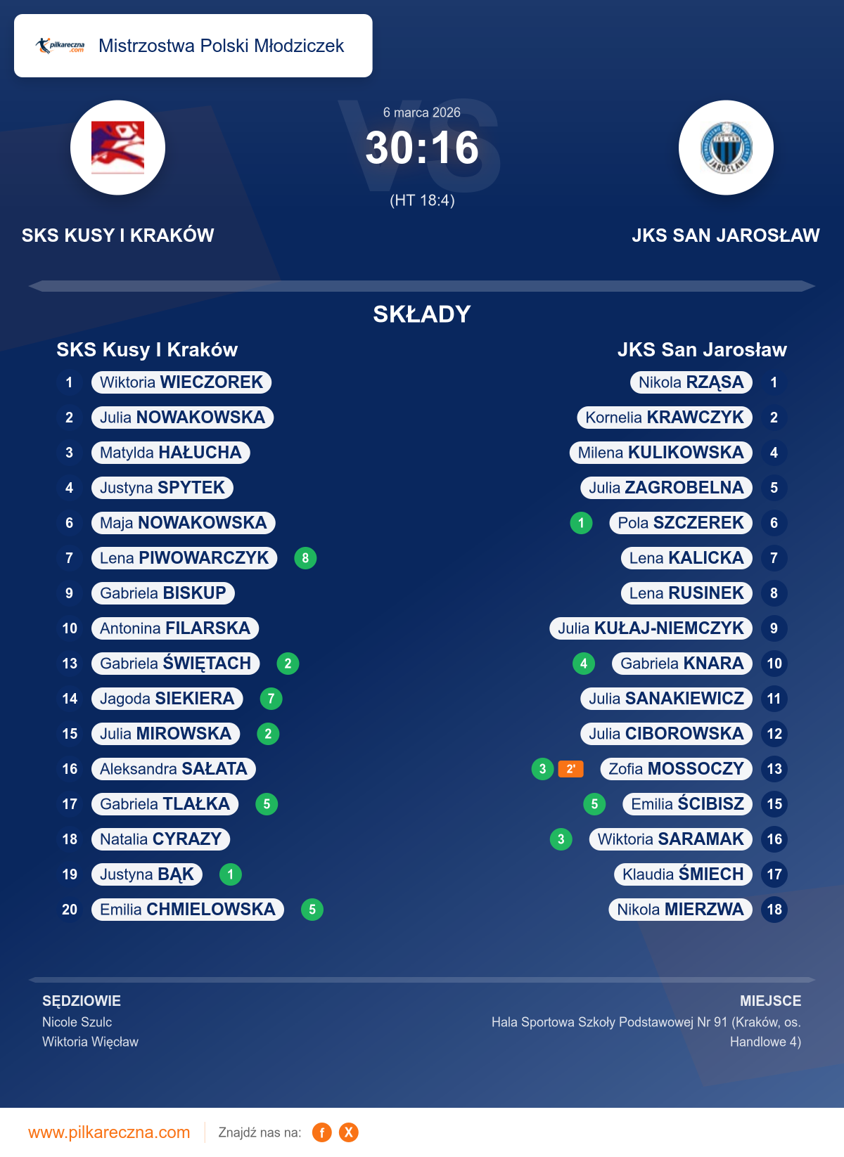Zawodnicy: Lena Piwowarczyk (8), Jagoda Siekiera (7), Emilia Chmielowska (5), Gabriela Tlałka (5), Gabriela Świętach (2), Julia Mirowska (2), Justyna Bąk (1), Aleksandra Sałata, Antonina Filarska, Gabriela Biskup, Julia Nowakowska, Justyna Spytek, Maja Nowakowska, Matylda Hałucha, Natalia Cyrazy, Wiktoria Wieczorek