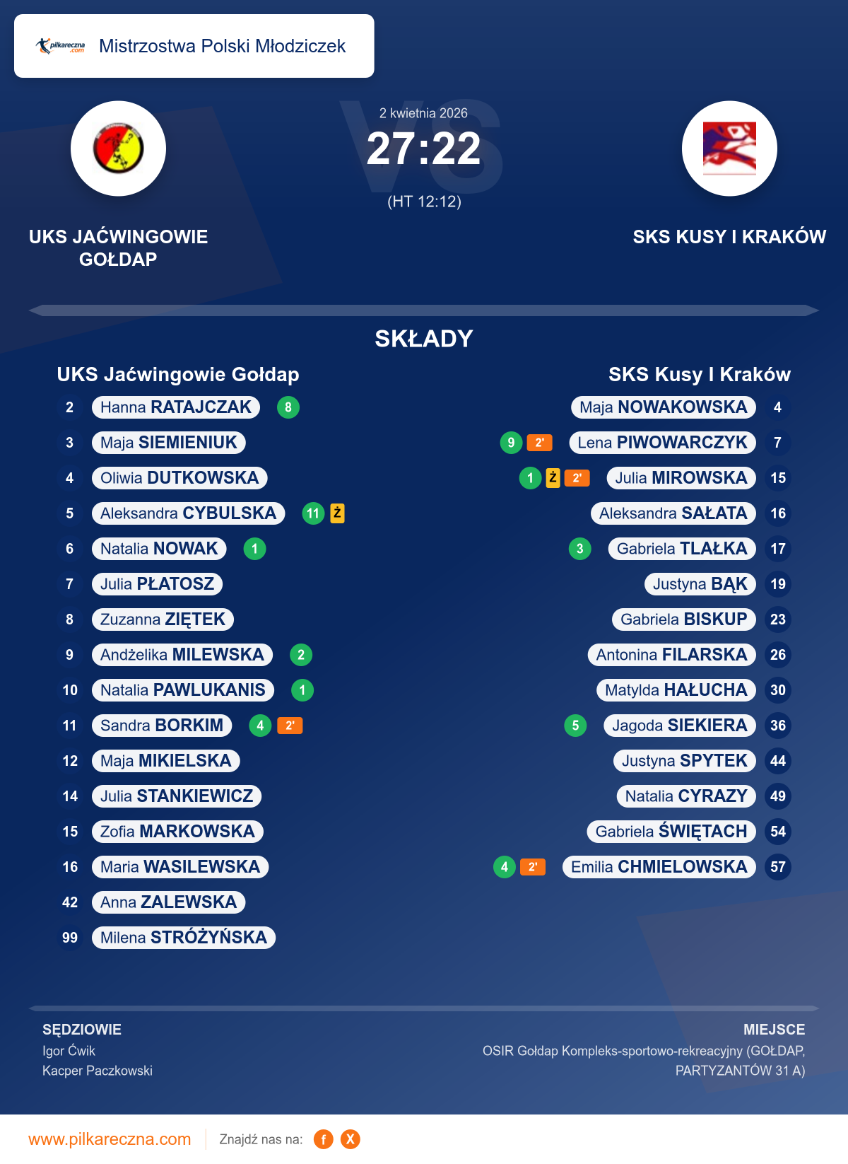 Uwagi: W drugiej połowie meczu zawodniczka SKS Kusy I Kraków nr 19 - Bąk Justyna doznała urazu głowy.