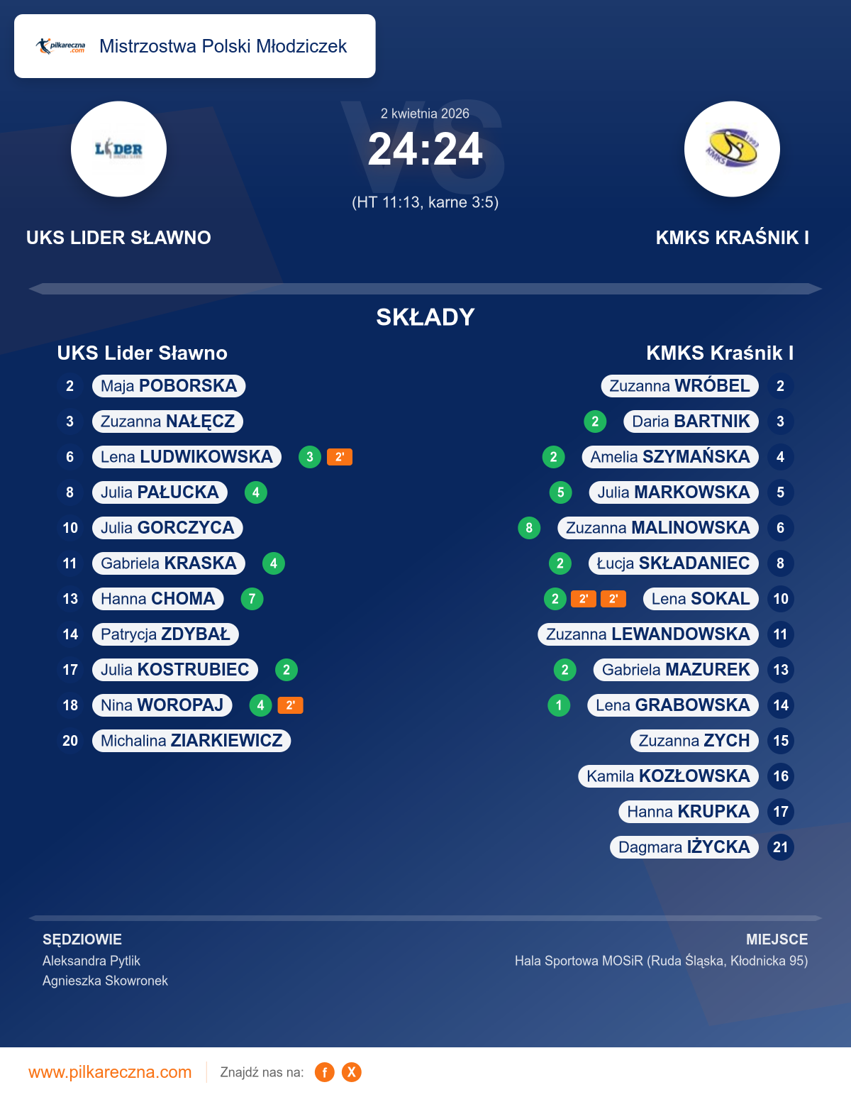 Zawodnicy: Zuzanna Malinowska (8), Julia Markowska (5), Amelia Szymańska (2), Daria Bartnik (2), Gabriela Mazurek (2), Lena Sokal (2), Łucja Składaniec (2), Lena Grabowska (1), Hanna Krupka, Zuzanna Lewandowska, Zuzanna Wróbel, Zuzanna Zych