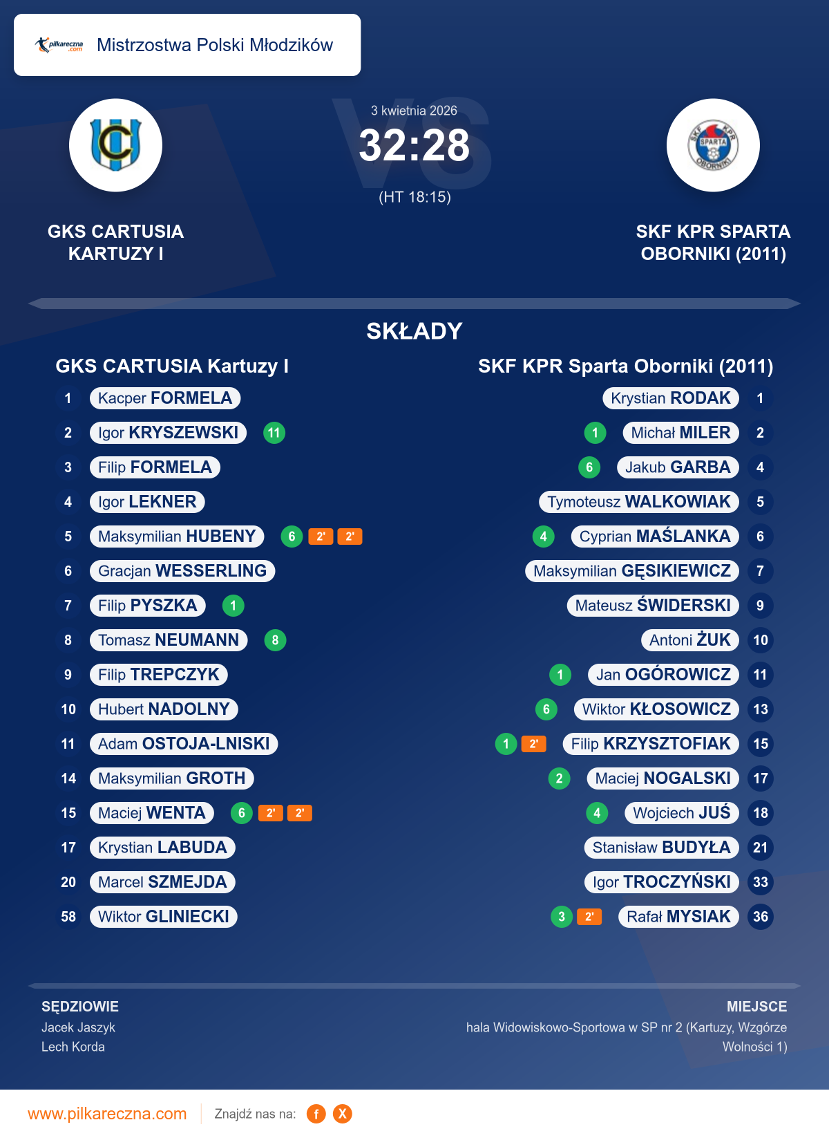 Uwagi: W 37 minucie meczu trener drużyny SKF KPR Sparta Oborniki (2011) CEBULSKI Przemysław został ukarany upomnieniem za niesportowe zachowanie podczas czasu dla drużyny zgodnie z przepisem 8:7a