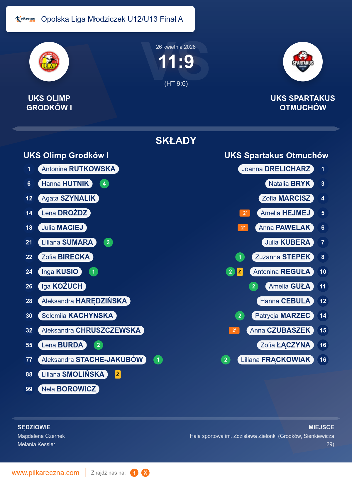 Uwagi: Trener drużyny gości UKS Spartakus Otmuchów Wiesław Bukatryk w 26 minucie meczu otrzymał kare upomnienia za krytykowanie decyzji sędziowskich zgodnie z przepisem 8:7aw zw. z 16:1b.