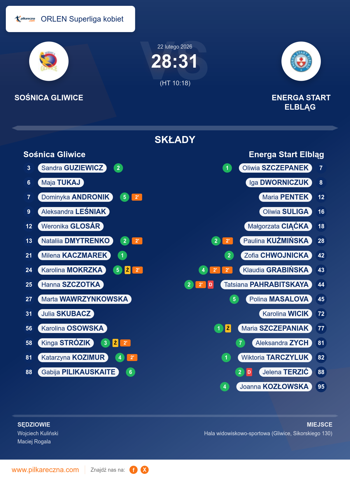 Uwagi: 1.W 45 min.39 sek. zawodniczka PAHRABITSKAYA Tatsiana nr 44 - Energa Start Elbląg otrzymała karę dyskwalifikacji za niebezpieczny faul pociągnięcie za bark zawodniczki będącej w biegu zgodnie przepisem 8:5. 2.W 48 min.01 sek. zawodniczka TERZIĆ Jelena nr 88 - Energa Start Elbląg otrzymała karę dyskwalifikacji za niebezpieczny faul uderzenie w głowę zawodniczki drużyny przeciwnej zgodnie przepisem 8:5.