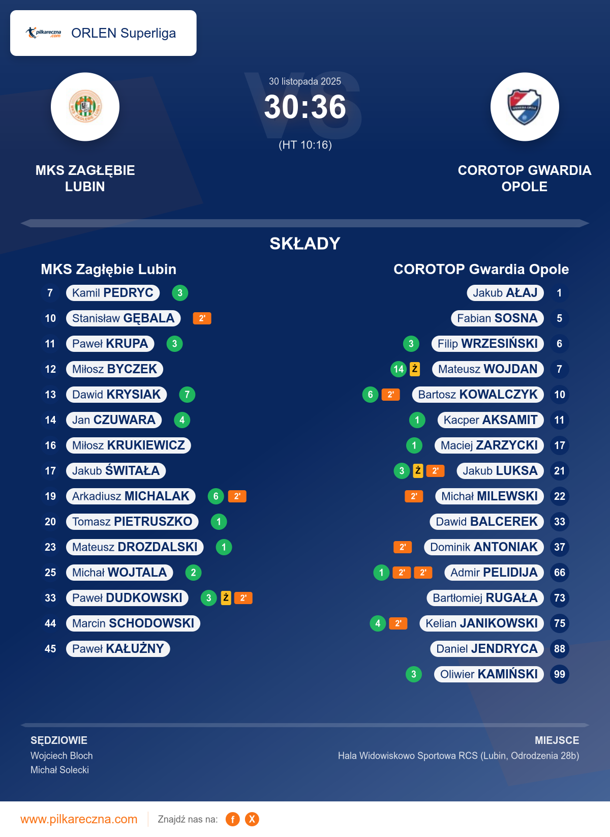 MKS Zagłębie Lubin 30–36 COROTOP Gwardia Opole