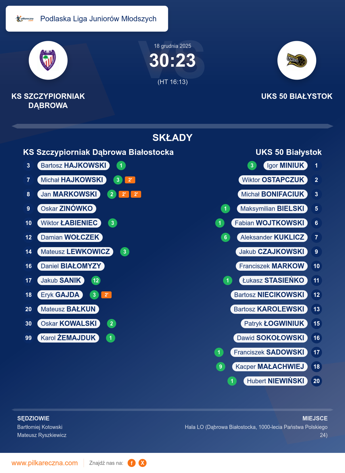 Zawodnicy: Jakub Sanik (12), Eryk Gajda (3), Mateusz Lewkowicz (3), Michał Hajkowski (3), Wiktor Łabieniec (3), Jan Markowski (2), Oskar Kowalski (2), Bartosz Hajkowski (1), Karol Żemajduk (1), Daniel Białomyzy, Oskar Zinówko