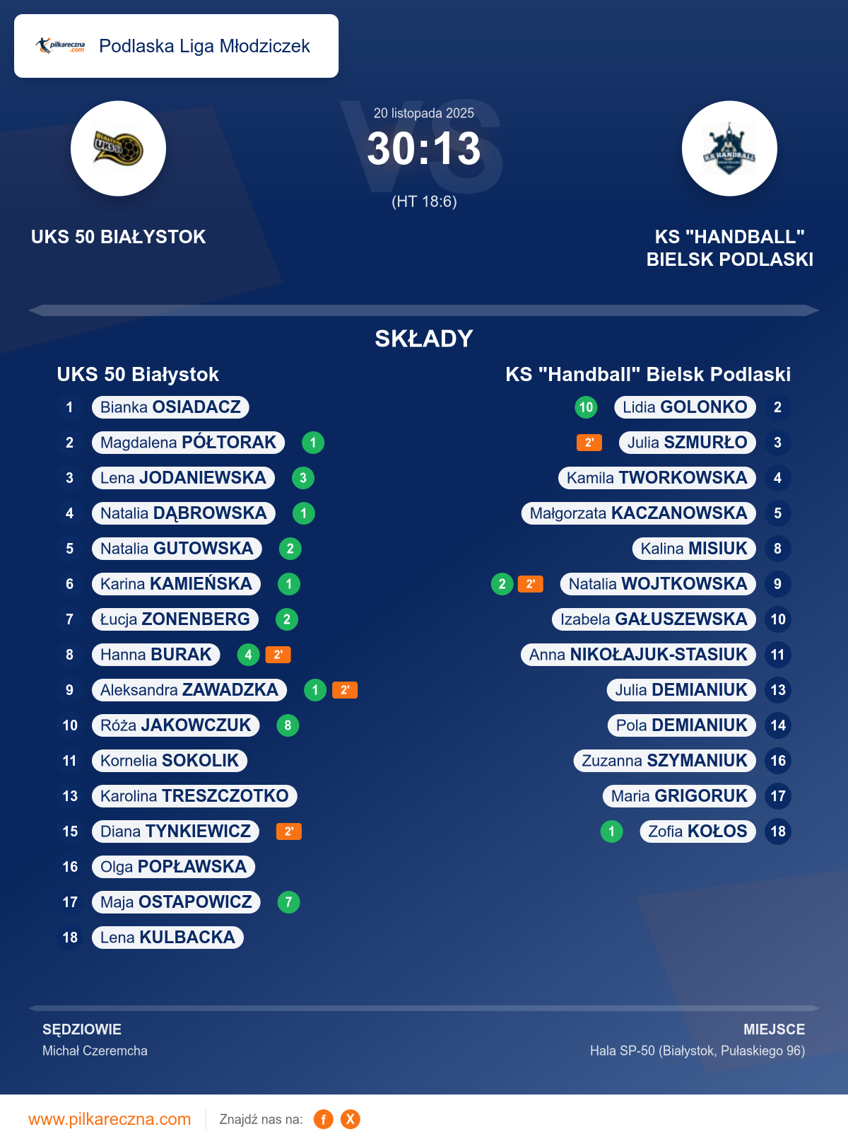 UKS 50 Białystok 30–13 KS "Handball" Bielsk Podlaski