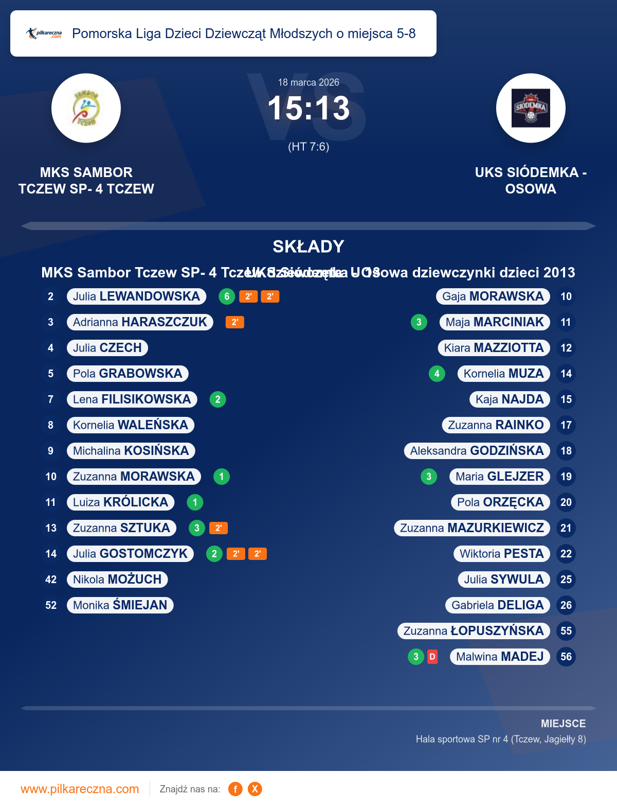 Uwagi: Zawodniczka drużyny gości UKS Siódemka Osowa z nr 56 MADEJ Malwina otrzymała kare dyskwalifikacji za szczególnie niebezpieczny dla zdrowia faul na podstawie przepisu 8.5. Zawodniczka która doznała faulu miała rozcięty łuk brwiowy.