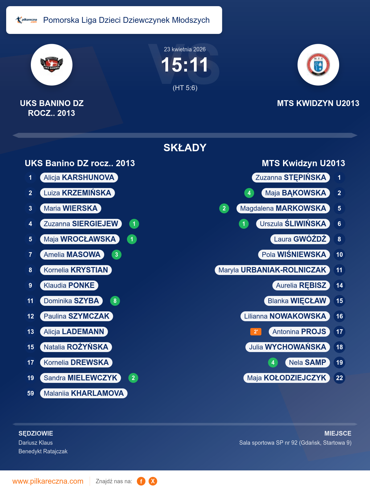 Zawodnicy: Maja Bąkowska (4), Nela Samp (4), Magdalena Markowska (2), Urszula Śliwińska (1), Antonina Projs, Aurelia Rębisz, Blanka Więcław, Julia Wychowańska, Laura Gwóźdź, Maja Kołodziejczyk, Maryla Urbaniak-rolniczak, Pola Wiśniewska