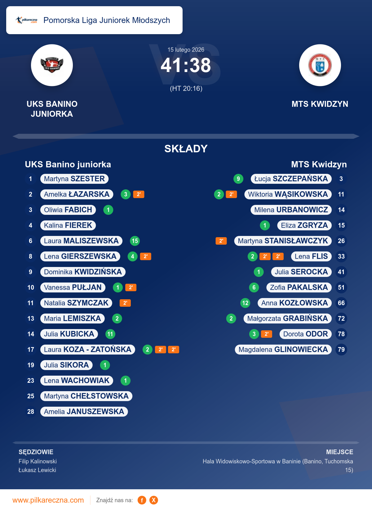 Zawodnicy: Laura Maliszewska (15), Julia Kubicka (11), Lena Gierszewska (4), Amelka Łazarska (3), Laura Koza - Zatońska (2), Maria Lemiszka (2), Julia Sikora (1), Lena Wachowiak (1), Oliwia Fabich (1), Vanessa Pułjan (1), Amelia Januszewska, Dominika Kwidzińska, Martyna Chełstowska, Martyna Szester, Natalia Szymczak