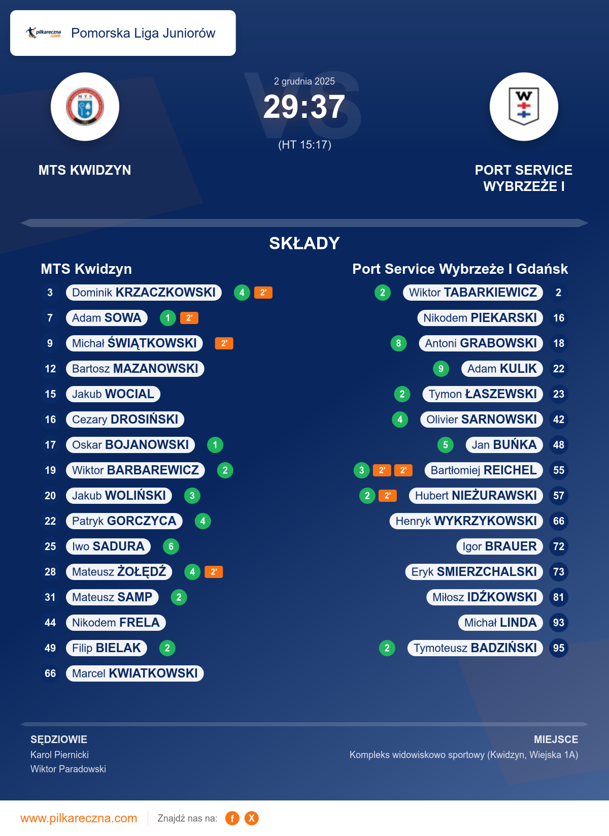 Uwagi: Zawodnik drużyny gości Port Service Wybrzeże I Gdańsk oznaczony nr 22 KULIK Adam w wyniku niefortunnego zdarzenia na parkiecie doznał kontuzji. Ratownik zabezpieczający zawody od strony medycznej stwierdził rozcięcie oraz złamanie nosa. Oznajmiono, że zawodnik po zawodach uda się na szpitalny oddział ratunkowy.