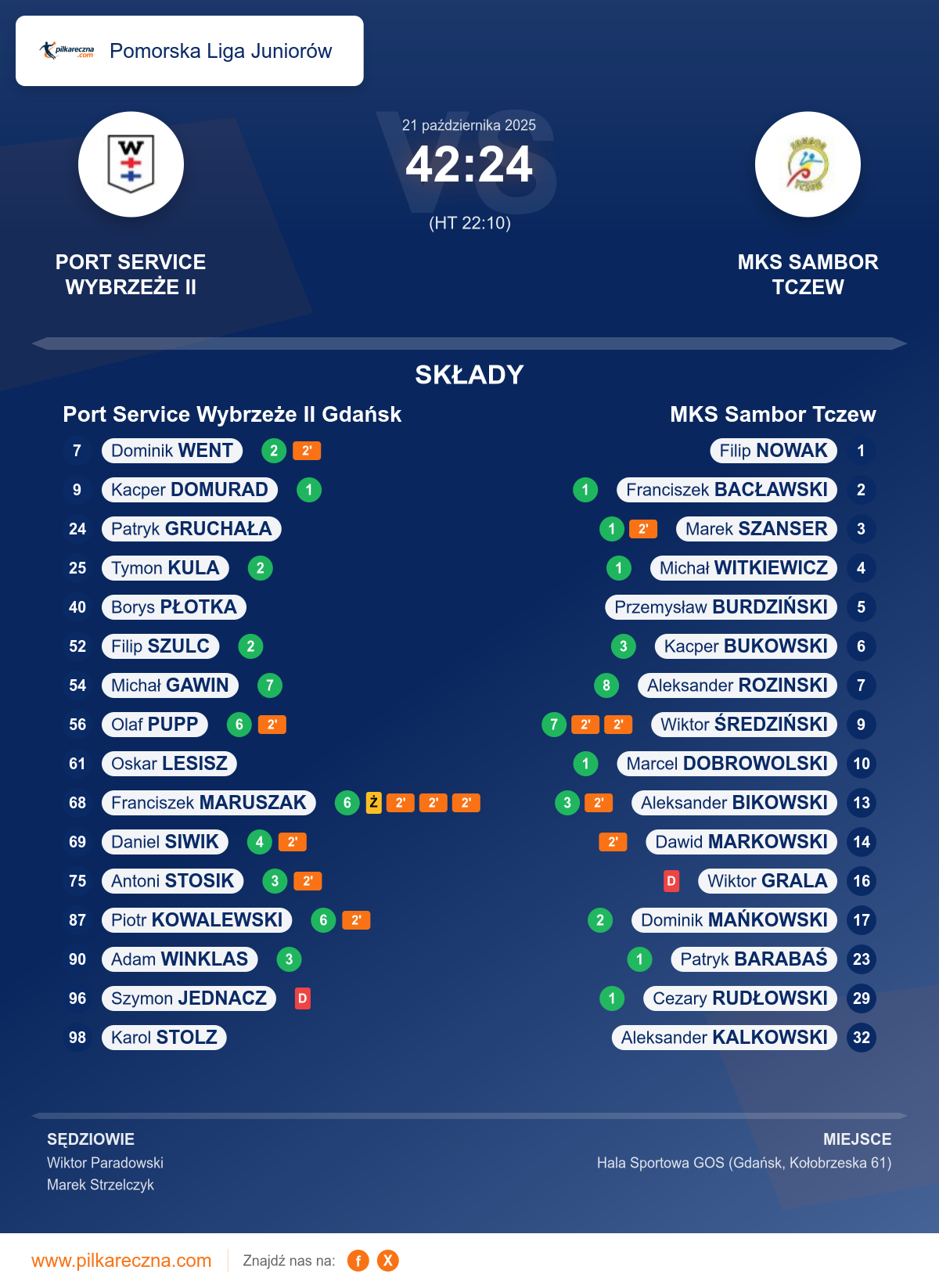 Uwagi: Zawodnik MKS Sambor Tczew z nr 16 GRALA Wiktor w 19 minucie 12 sekundzie meczu otrzymał dyskwalifikację połączoną z niebieska kartką zgodnie z przepisem 8.6a pchnięcie od tyłu w kontrataku zawodnika, który był w wyskoku i nie spodziewał się faulu i nie mógł się przed nim uchronić. Zachowanie wyjątkowo lekkomyślne przez faulującego. Zawodnik Port Service Wybrzeże II Gdańsk nr 96 JEDNACZ Szymon w 19 minucie 12 sekundzie meczu otrzymał dyskwalifikacje zgodnie z 8.9d po faulu w rewanżu rzucił piłką w przeciwnika, ale nie doszło do kontaktu, gdyż zareagował sędzia rozdzielając zawodników. Trener drużyny gości MKS Sambor Tczew Ortmann Michał w 30 minucie meczu otrzymał upomnienie zgodnie z 8.7a. Trener drużyny gospodarzy