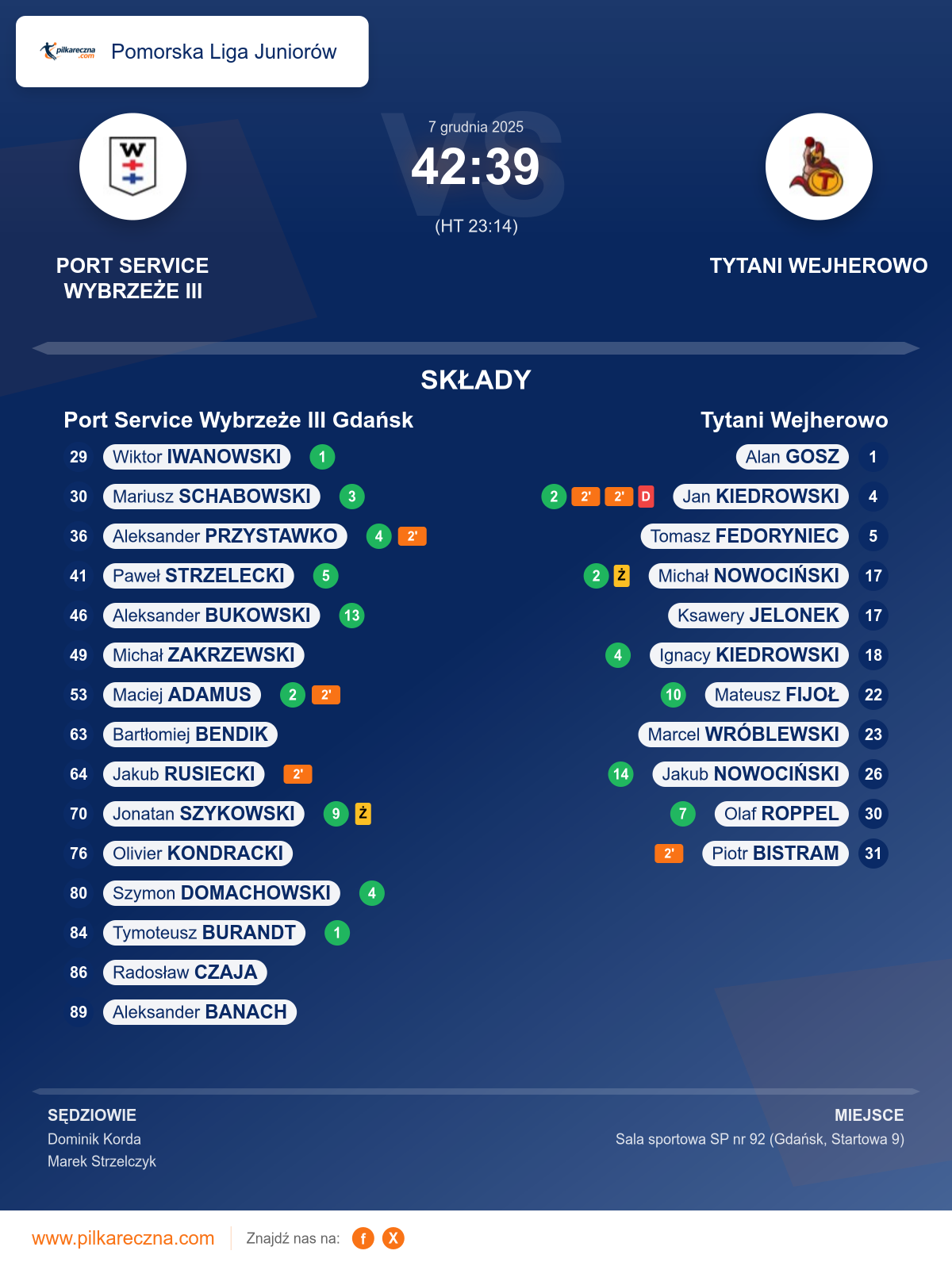 Uwagi: W 38 minucie 47 sekundzie meczu zawodnik drużyny Tytani Wejherowo nr 4 Kiedrowski Jan otrzymał dyskwalifikacje zgodnie z przepisem 8.5b przewrócenie przeciwnika bez możliwości ataku pilki