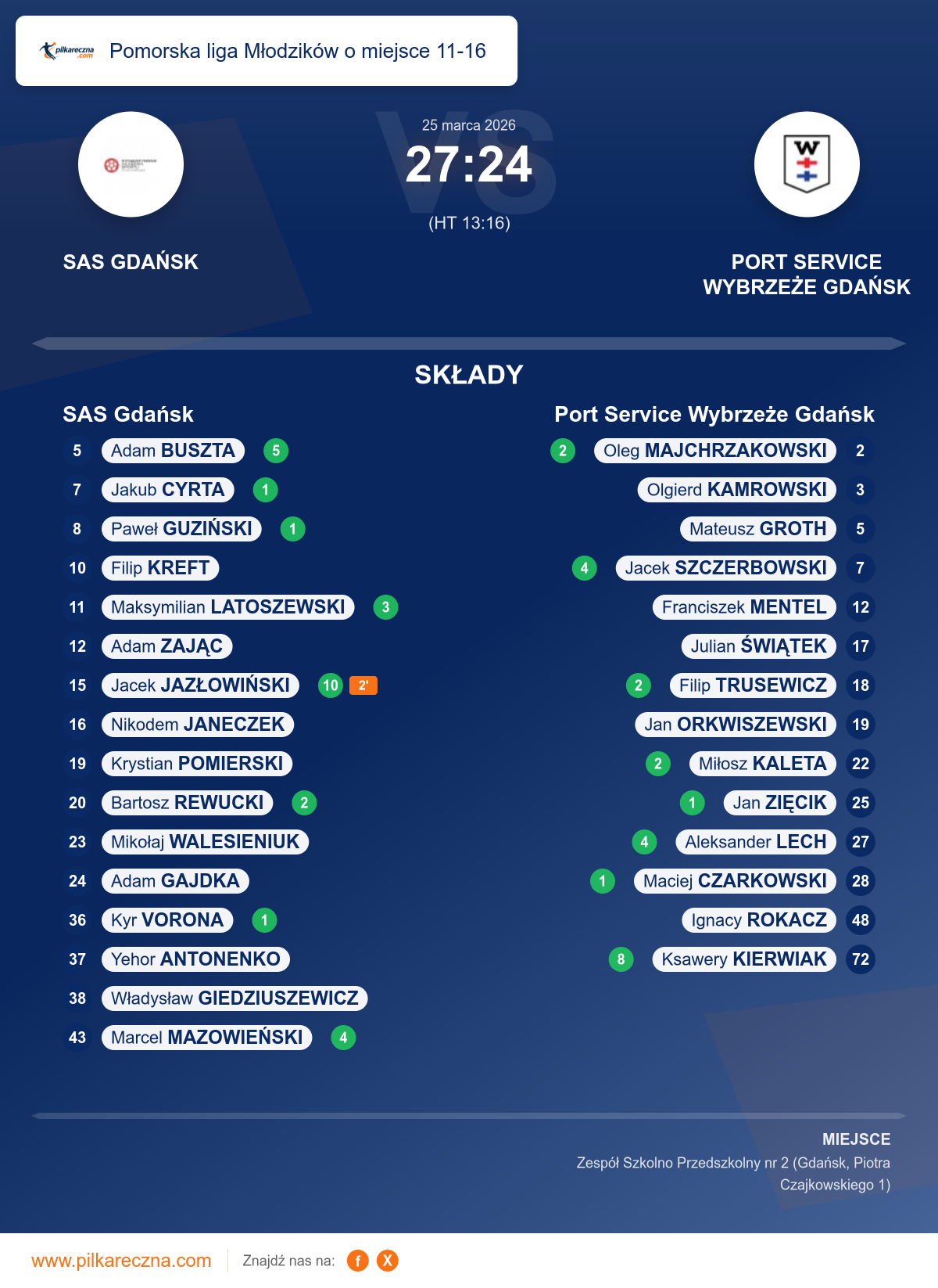 Zawodnicy: Ksawery Kierwiak (8), Aleksander Lech (4), Filip Trusewicz (2), Miłosz Kaleta (2), Oleg Majchrzakowski (2), Jan Zięcik (1), Maciej Czarkowski (1), Ignacy Rokacz, Jan Orkwiszewski, Julian Świątek, Mateusz Groth, Olgierd Kamrowski