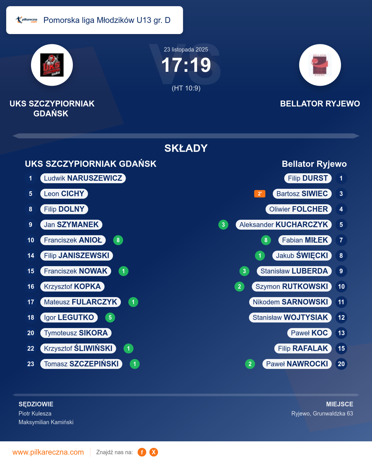 UKS SZCZYPIORNIAK GDAŃSK 17–19 Bellator Ryjewo