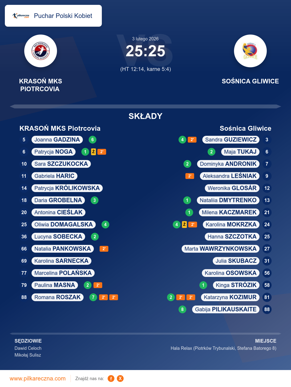 Wynik: 25–25 (HT 12–14), po karnych 5–4