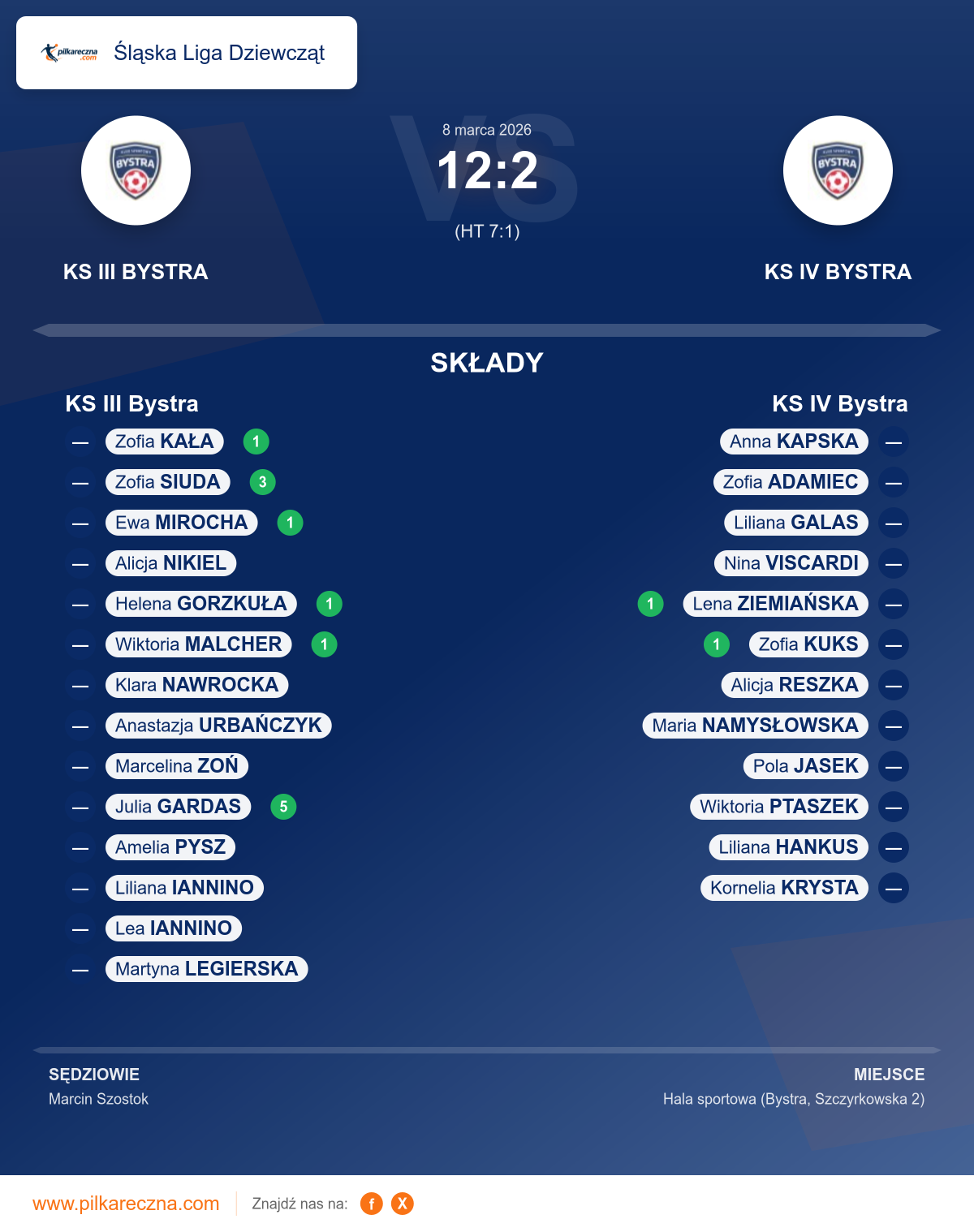 Zawodnicy: Julia Gardas (5), Zofia Siuda (3), Ewa Mirocha (1), Helena Gorzkuła (1), Wiktoria Malcher (1), Zofia Kała (1), Alicja Nikiel, Amelia Pysz, Anastazja Urbańczyk, Klara Nawrocka, Lea Iannino, Liliana Iannino, Marcelina Zoń, Martyna Legierska
