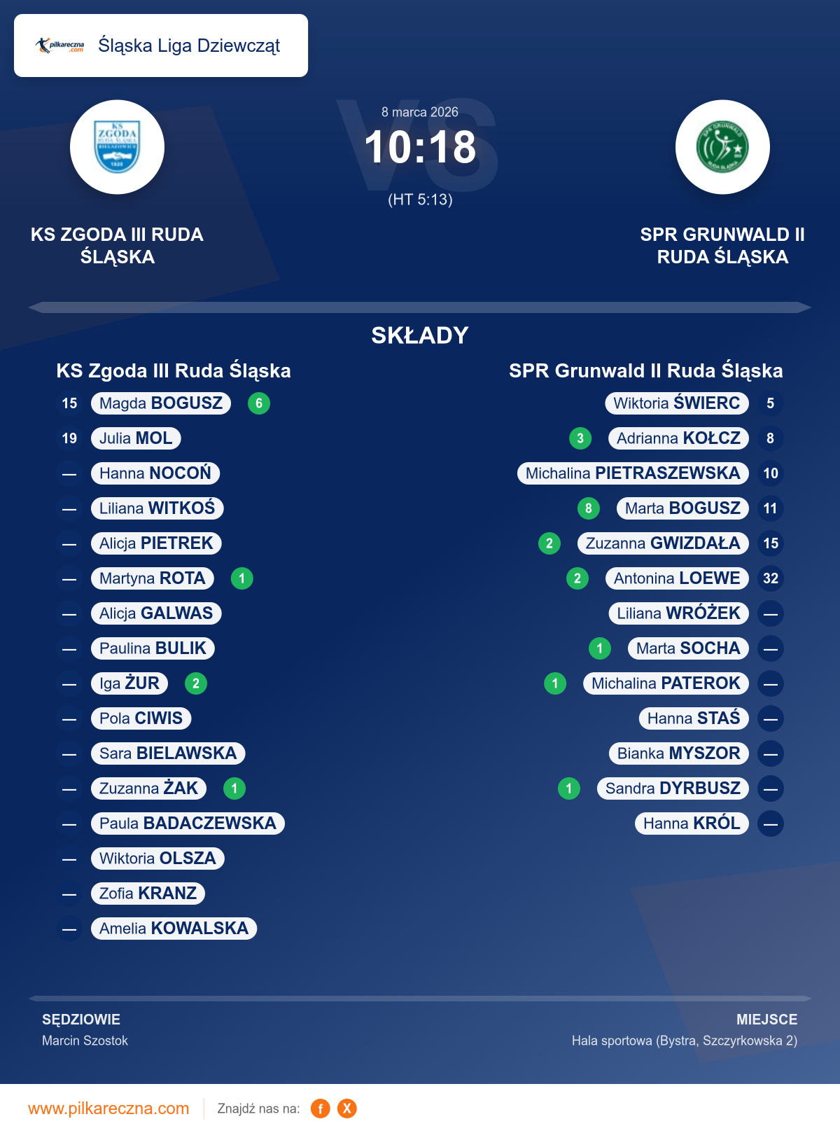 Zawodnicy: Marta Bogusz (8), Adrianna Kołcz (3), Antonina Loewe (2), Zuzanna Gwizdała (2), Marta Socha (1), Michalina Paterok (1), Sandra Dyrbusz (1), Bianka Myszor, Hanna Król, Hanna Staś, Michalina Pietraszewska, Wiktoria Świerc