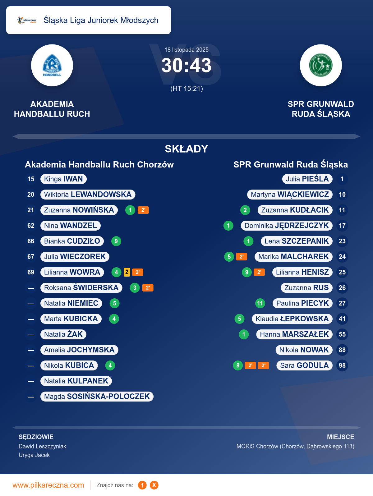 Akademia Handballu Ruch Chorzów 30–43 SPR Grunwald Ruda Śląska