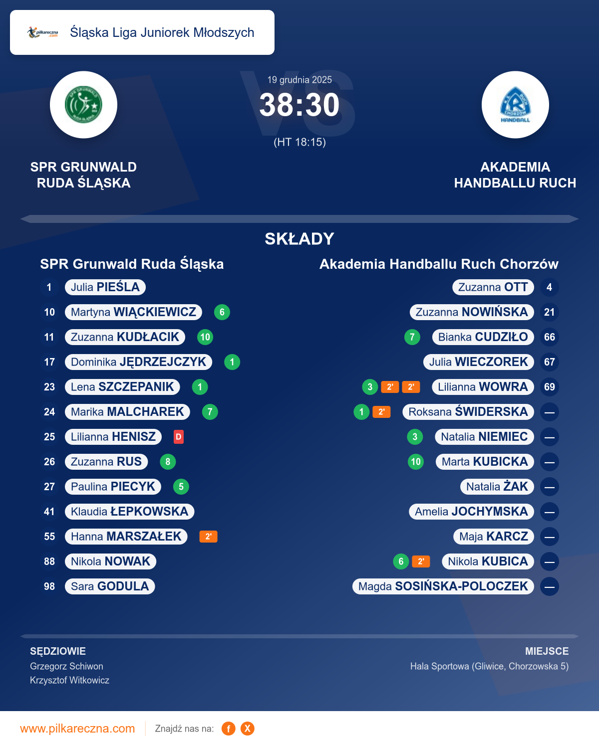 Uwagi: 1. Zawodniczka zespołu SPR Grunwald Ruda Śląska z nr 25 Henisz Liliana otrzymała karę dyskwalifikacji w 3 minucie 51 sekundzie zgodnie z przepisem 8.5a. 2. Zawodniczka zespołu SPR Grunwald Ruda Śląska z re 98 Godula Sara doznała urazu lewego kolana.