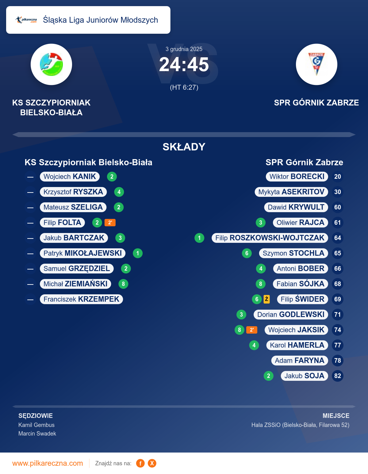 Zawodnicy: Fabian Sójka (8), Wojciech Jaksik (8), Filip Świder (6), Szymon Stochla (6), Antoni Bober (4), Karol Hamerla (4), Dorian Godlewski (3), Oliwier Rajca (3), Jakub Soja (2), Filip Roszkowski-wojtczak (1), Adam Faryna