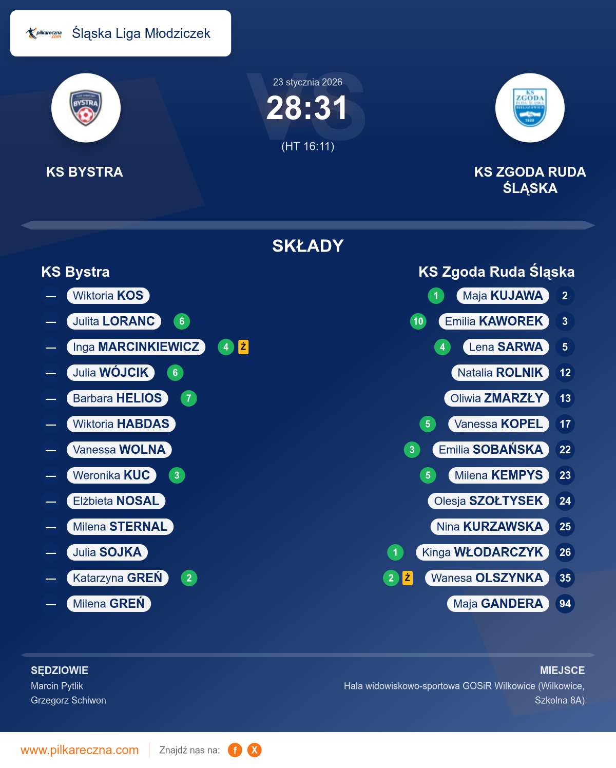 Zawodnicy: Barbara Helios (7), Julia Wójcik (6), Julita Loranc (6), Inga Marcinkiewicz (4), Weronika Kuc (3), Katarzyna Greń (2), Elżbieta Nosal, Julia Sojka, Milena Sternal, Vanessa Wolna, Wiktoria Habdas, Wiktoria Kos