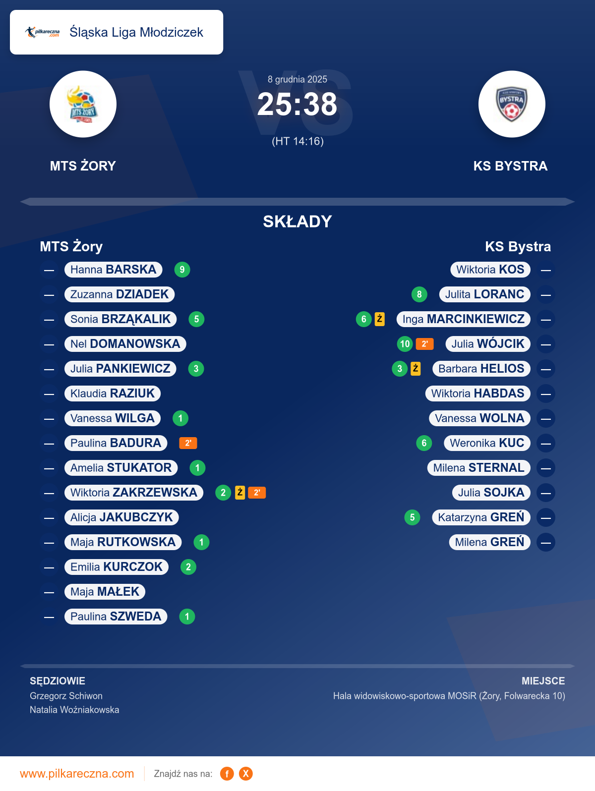Zawodnicy: Hanna Barska (9), Sonia Brząkalik (5), Julia Pankiewicz (3), Emilia Kurczok (2), Wiktoria Zakrzewska (2), Amelia Stukator (1), Maja Rutkowska (1), Paulina Szweda (1), Vanessa Wilga (1), Klaudia Raziuk, Maja Małek, Paulina Badura