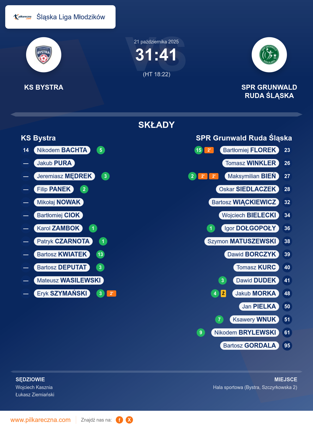 Zawodnicy: Bartosz Kwiatek (13), Nikodem Bachta (5), Bartosz Deputat (3), Eryk Szymański (3), Jeremiasz Mędrek (3), Filip Panek (2), Karol Zambok (1), Patryk Czarnota (1), Jakub Pura, Mateusz Wasilewski