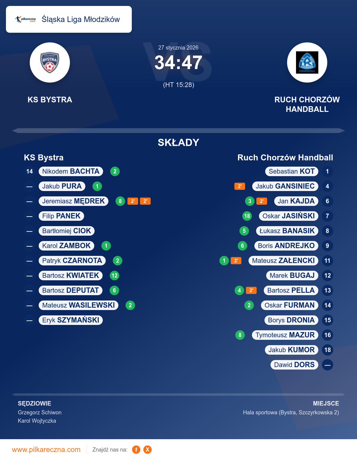 Zawodnicy: Bartosz Kwiatek (12), Jeremiasz Mędrek (8), Bartosz Deputat (6), Mateusz Wasilewski (2), Nikodem Bachta (2), Patryk Czarnota (2), Jakub Pura (1), Karol Zambok (1), Eryk Szymański, Filip Panek