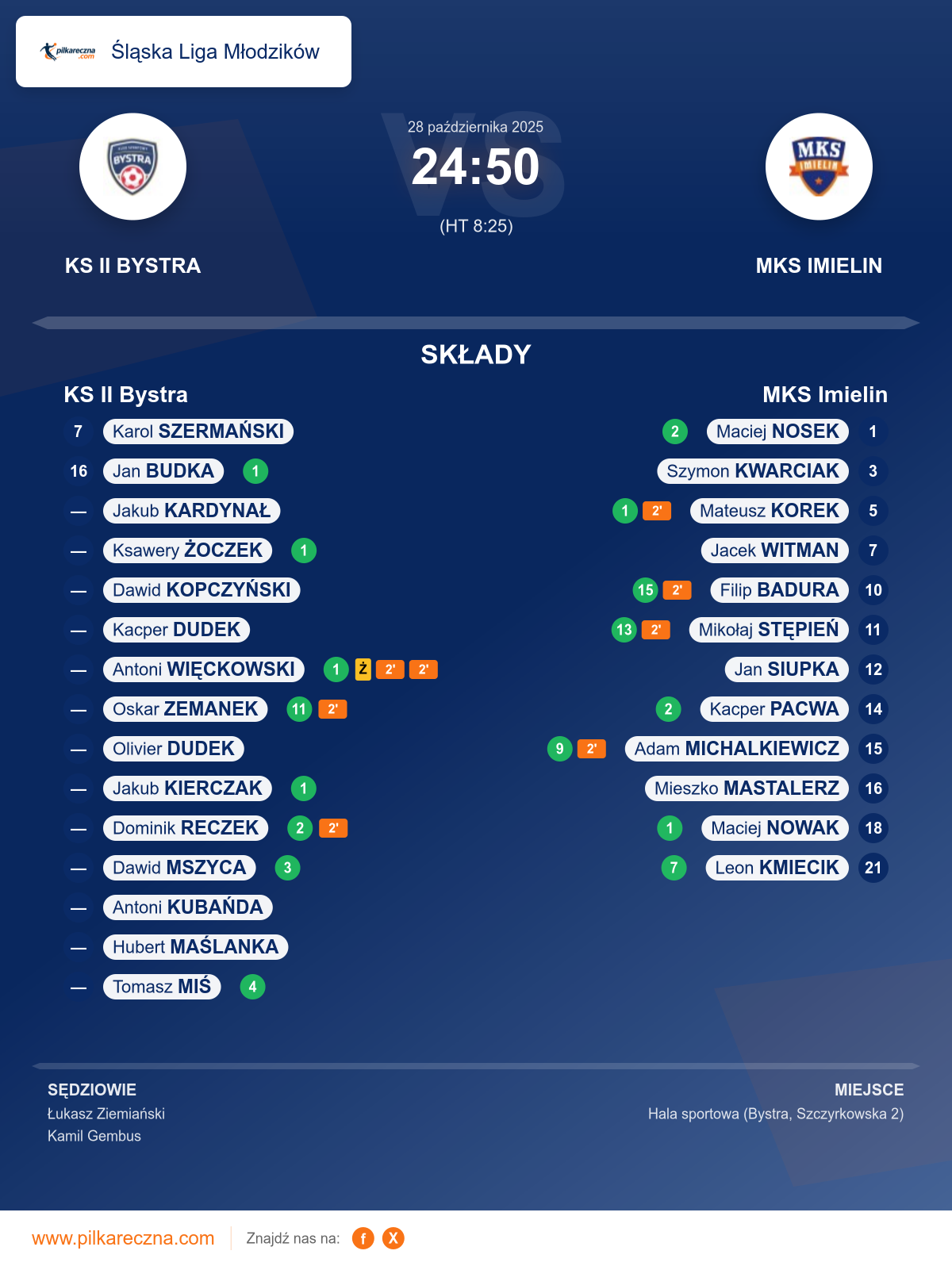 Zawodnicy: Oskar Zemanek (11), Tomasz Miś (4), Dawid Mszyca (3), Dominik Reczek (2), Antoni Więckowski (1), Jakub Kierczak (1), Jan Budka (1), Ksawery Żoczek (1), Antoni Kubańda, Dawid Kopczyński, Jakub Kardynał, Kacper Dudek, Karol Szermański