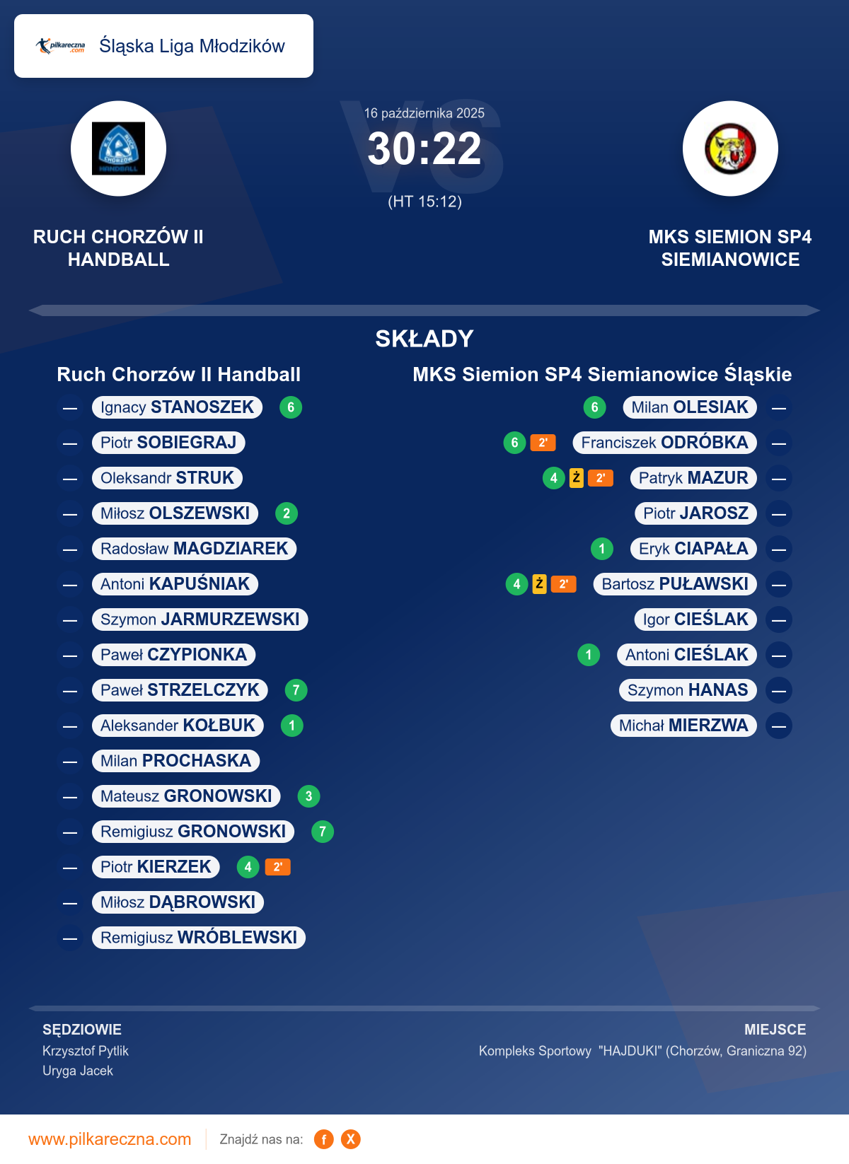 Ruch Chorzów II Handball 30–22 MKS Siemion SP4 Siemianowice Śląskie