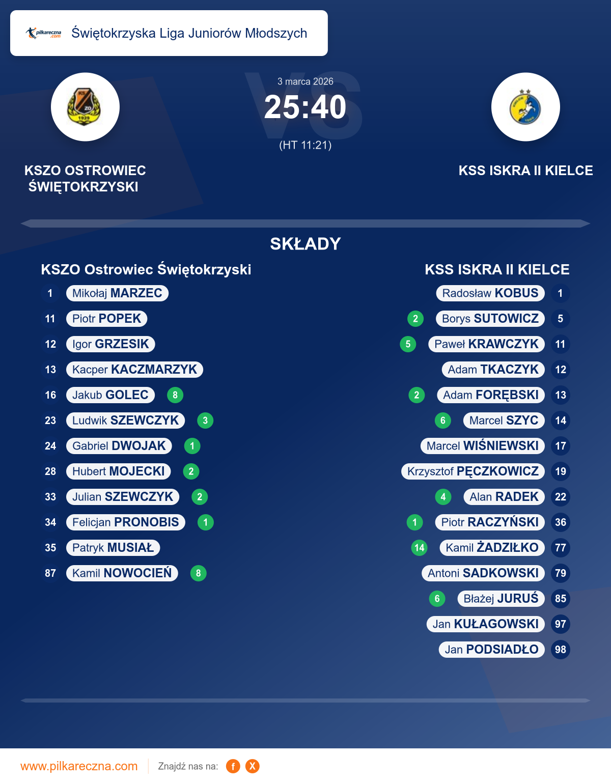 Zawodnicy: Jakub Golec (8), Kamil Nowocień (8), Ludwik Szewczyk (3), Hubert Mojecki (2), Julian Szewczyk (2), Felicjan Pronobis (1), Gabriel Dwojak (1), Igor Grzesik, Kacper Kaczmarzyk, Patryk Musiał, Piotr Popek