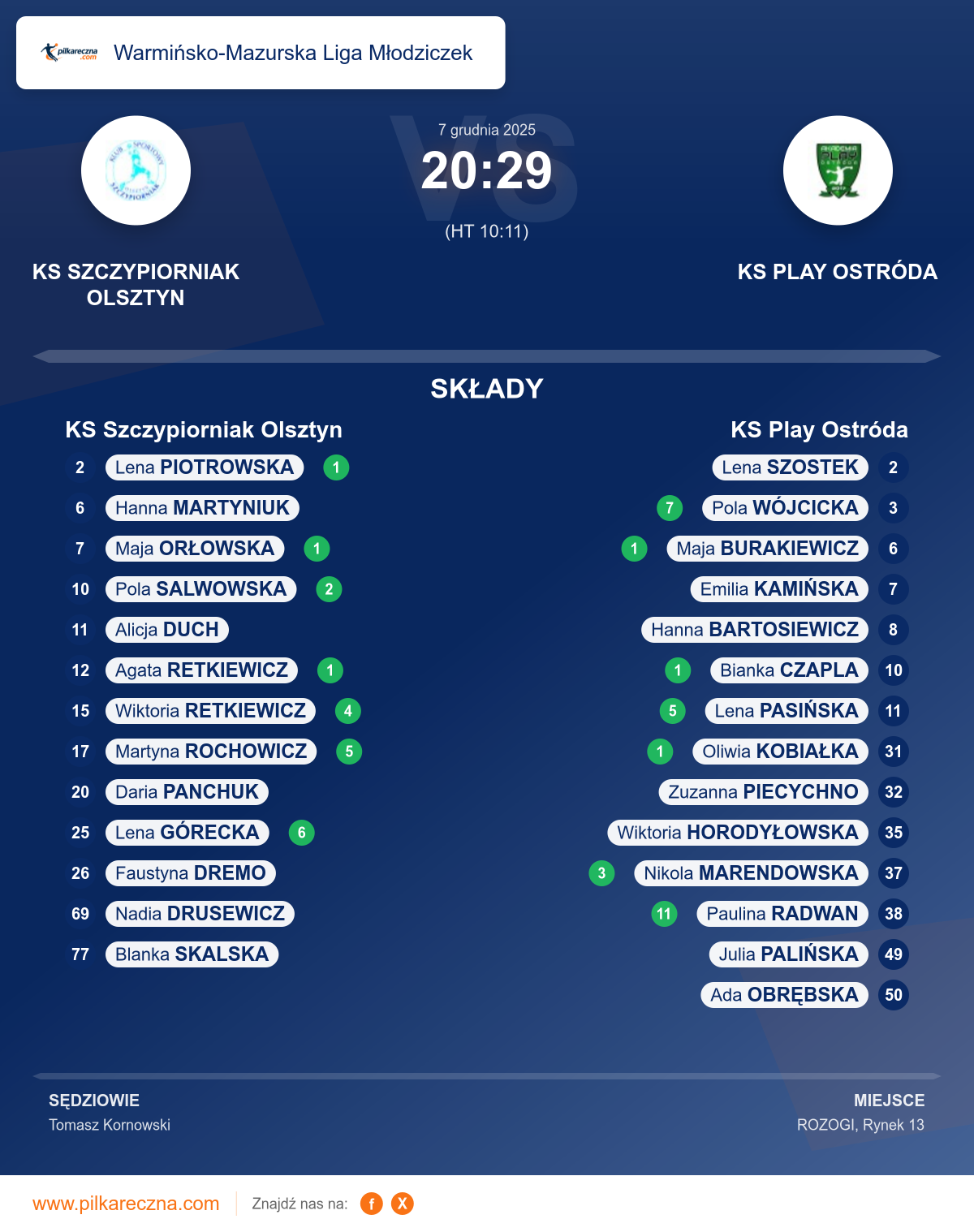 Zawodnicy: Paulina Radwan (11), Pola Wójcicka (7), Lena Pasińska (5), Nikola Marendowska (3), Bianka Czapla (1), Maja Burakiewicz (1), Oliwia Kobiałka (1), Ada Obrębska, Emilia Kamińska, Hanna Bartosiewicz, Julia Palińska, Lena Szostek, Wiktoria Horodyłowska, Zuzanna Piecychno