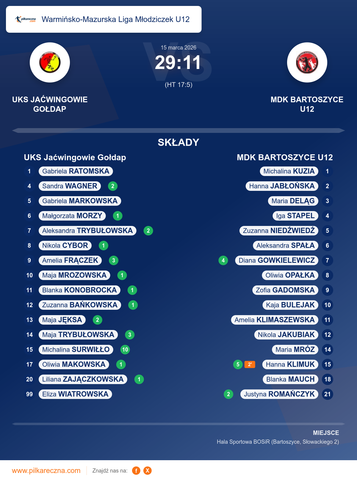 Zawodnicy: Michalina Surwiłło (10), Amelia Frączek (3), Maja Trybułowska (3), Aleksandra Trybułowska (2), Maja Jęksa (2), Sandra Wagner (2), Blanka Konobrocka (1), Liliana Zajączkowska (1), Maja Mrozowska (1), Małgorzata Morzy (1), Nikola Cybor (1), Oliwia Makowska (1), Zuzanna Bańkowska (1), Gabriela Markowska