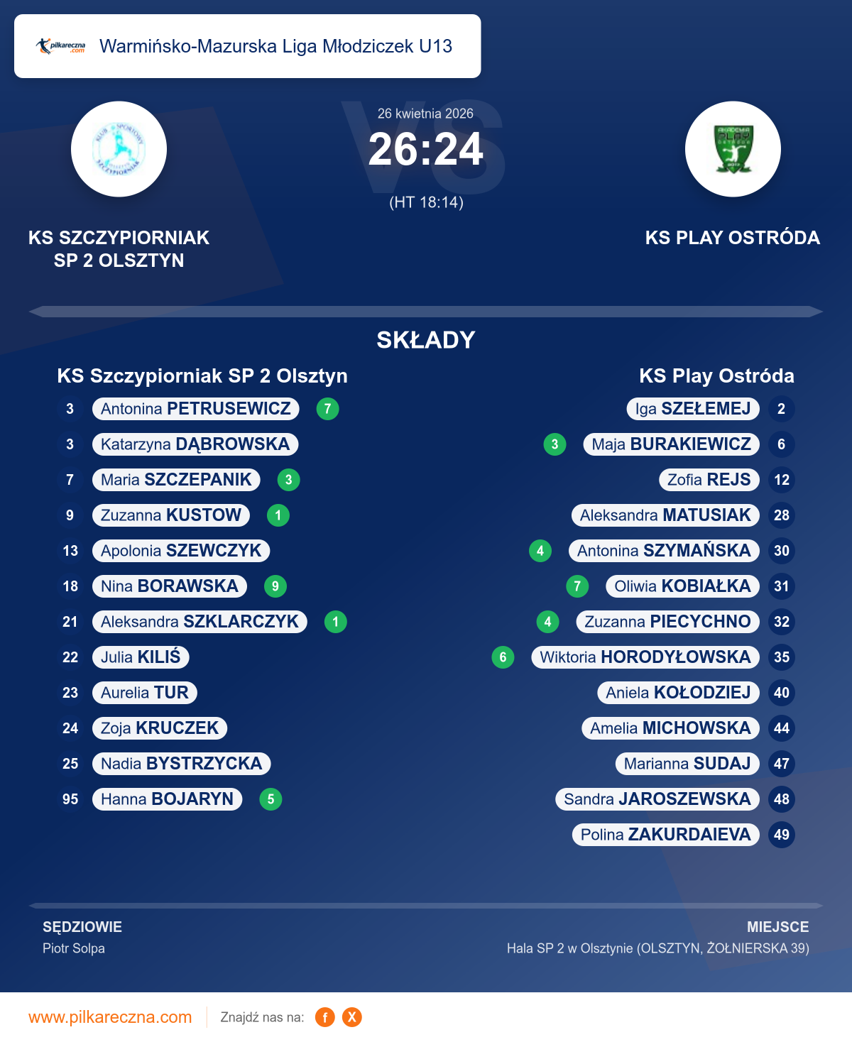 KS Szczypiorniak SP 2 Olsztyn 26–24 KS Play Ostróda