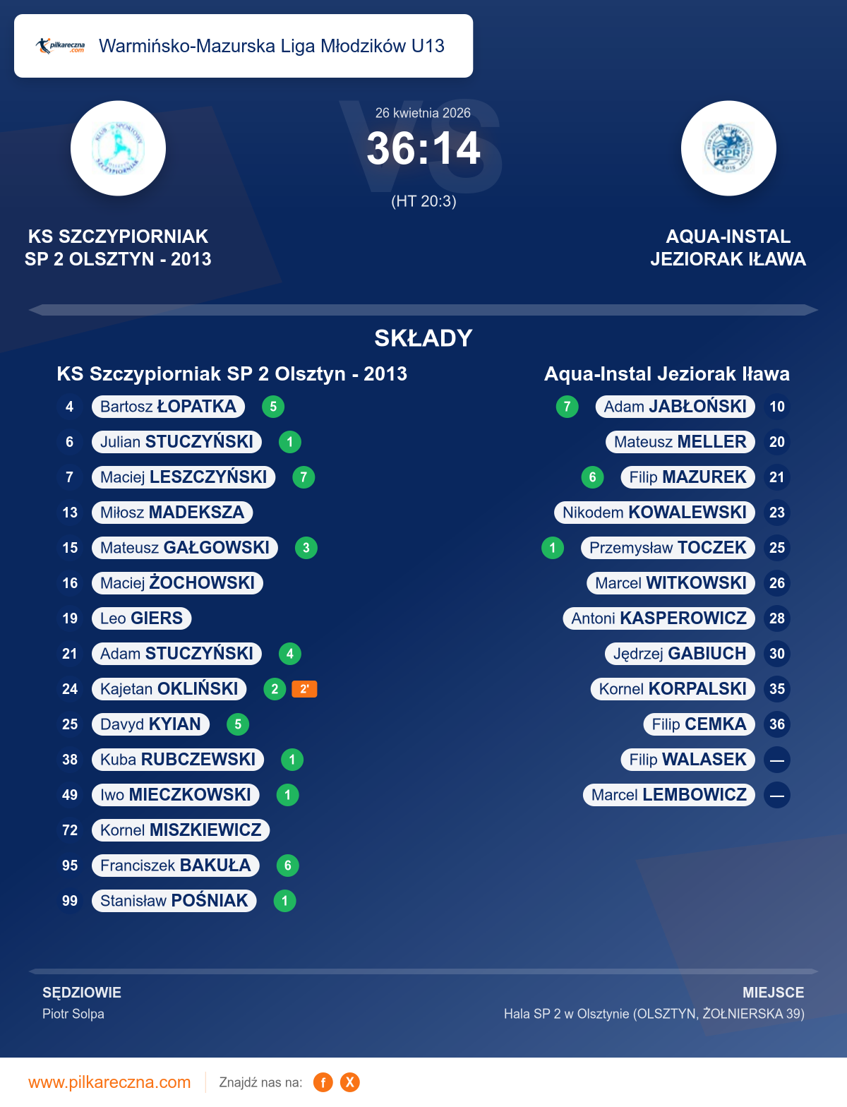 KS Szczypiorniak SP 2 Olsztyn - 2013 36–14 Aqua-Instal Jeziorak Iława
