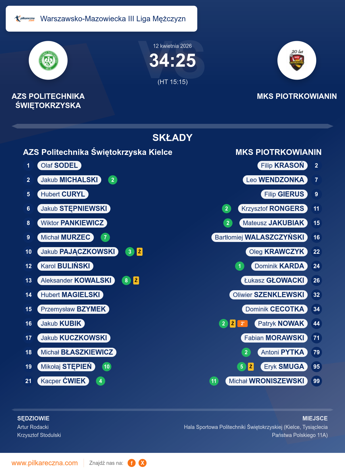 AZS Politechnika Świętokrzyska Kielce 34–25 MKS PIOTRKOWIANIN