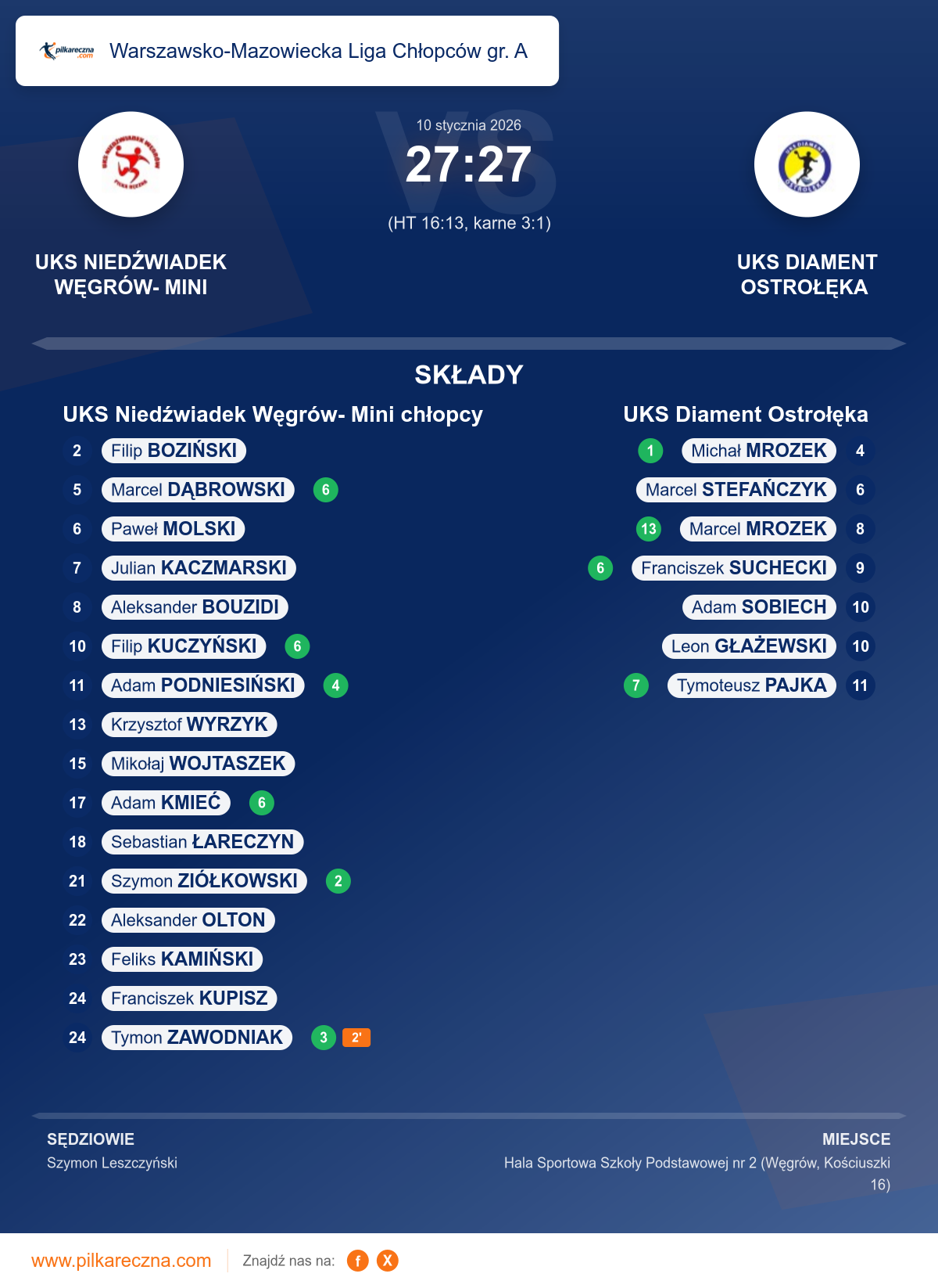 Wynik: 27–27 (HT 16–13), po karnych 3–1